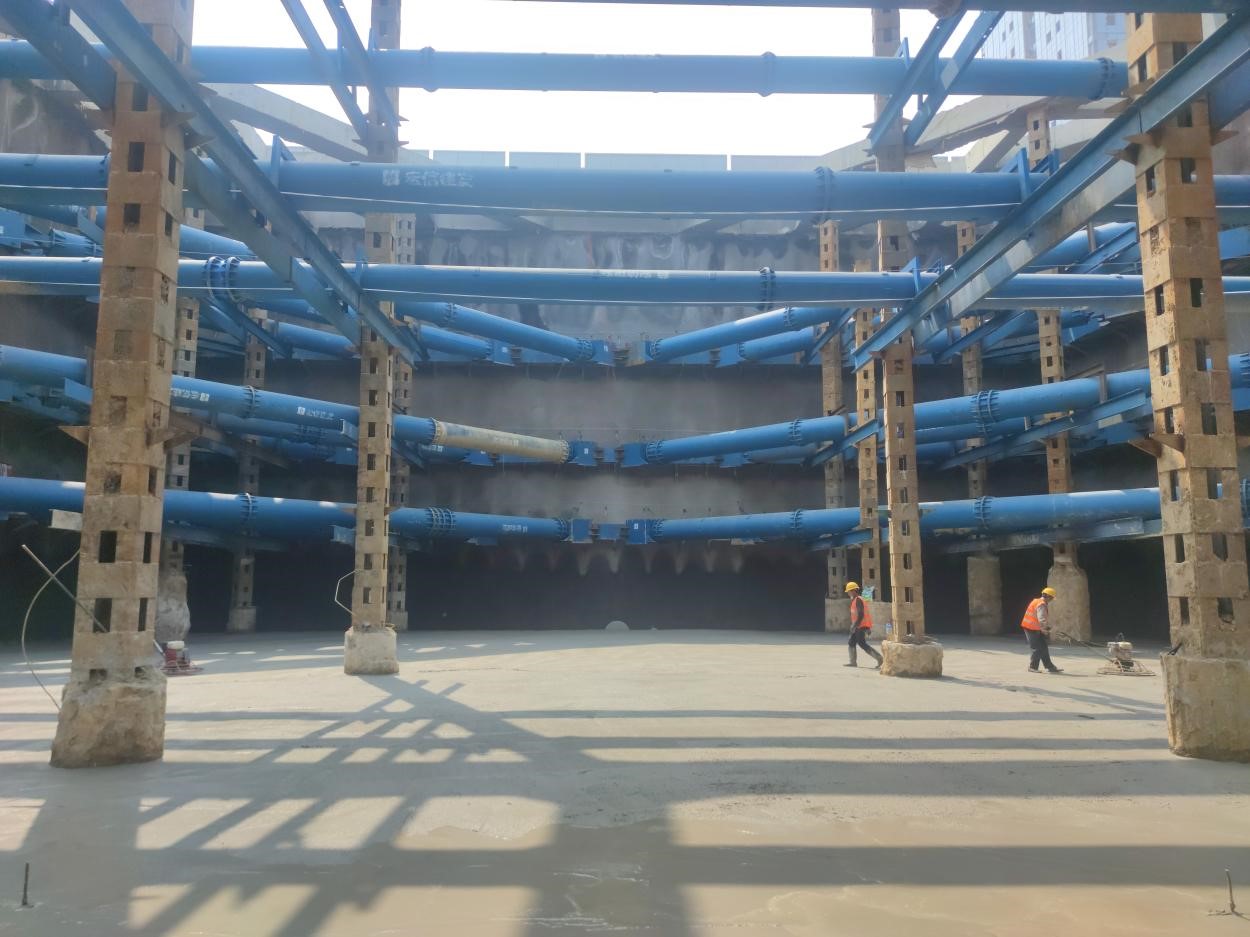 本次实施的D20节段为繁华大道与宿松路地道地下十字立交暗埋段,上层为繁华大道下穿、下层为宿松路下穿,双层结构深17m、纵向长度32m,横向长度33.8m,是本工程工期的控制性节段。为顺利推进,针对作业区域狭小、土方工程量大、多工序交叉等特点,施工前期项目办组织监理、施工等单位采取模拟推演风险源、优化土方开挖方案、组织协调工序衔接、优化施工空间布置等措施,于3月14日正式开始土方开挖。在遵循 “先撑后挖、水平分段、竖向分层”原则及“分层、分步、对称、平衡、限时”要点的基础上,保障基坑施工安全的同时,于4月19日顺利完成垫层浇筑,为后续主体结构施工创造良好的条件。
